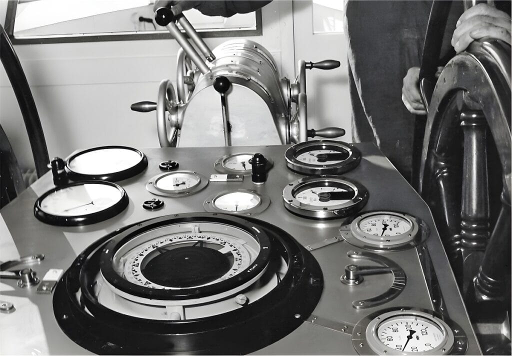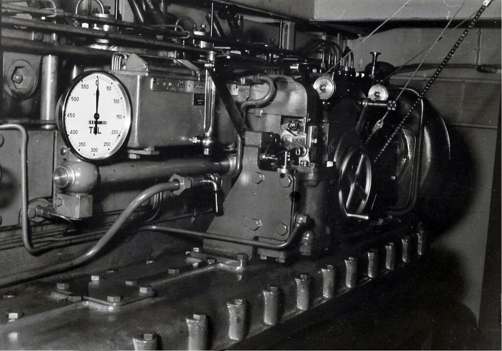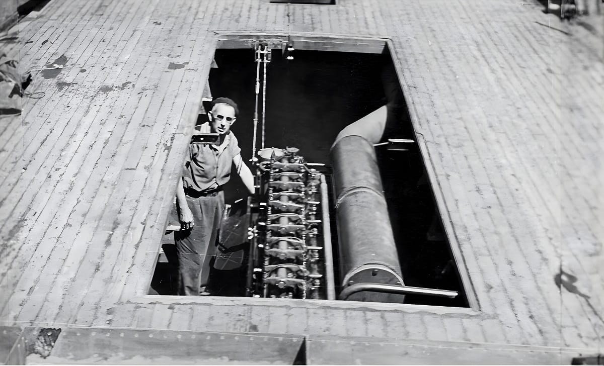L’evoluzione dei motori di bordo racconta una storia di innovazione tecnologica che ha cambiato il modo di navigare. Prima dell’avvento del motore a combustione interna, caratteristiche distintive dei piroscafi del primo ’900 erano il cosiddetto cofano di macchina, uno spazio aperto che permetteva di osservare direttamente il funzionamento delle macchine, e la plancia, o “banco di manovra”, con bussola e manometri. Emblematica era anche la ruota a caviglie del piroscafo Piemonte, ancora oggi installata nella sua posizione originaria, in quei tempi necessaria per governare i timoni manualmente. Con gli anni ’50 e ’60 si affermano sulle motonavi i motori Diesel prodotti dall’industria italiana, come il motore FIAT a 6 cilindri in linea, 4 tempi, da circa 350 cavalli vapore.
