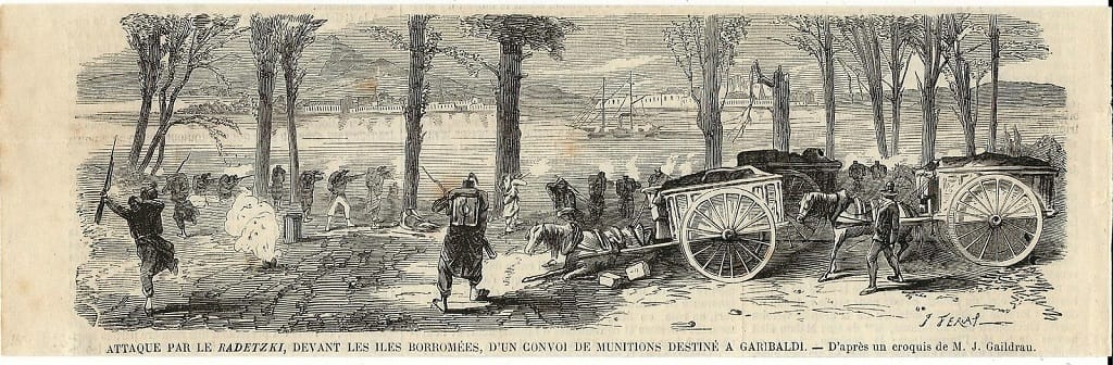 Le truppe austriache attaccano un convoglio di munizioni destinato a Garibaldi in una incisione del 1859