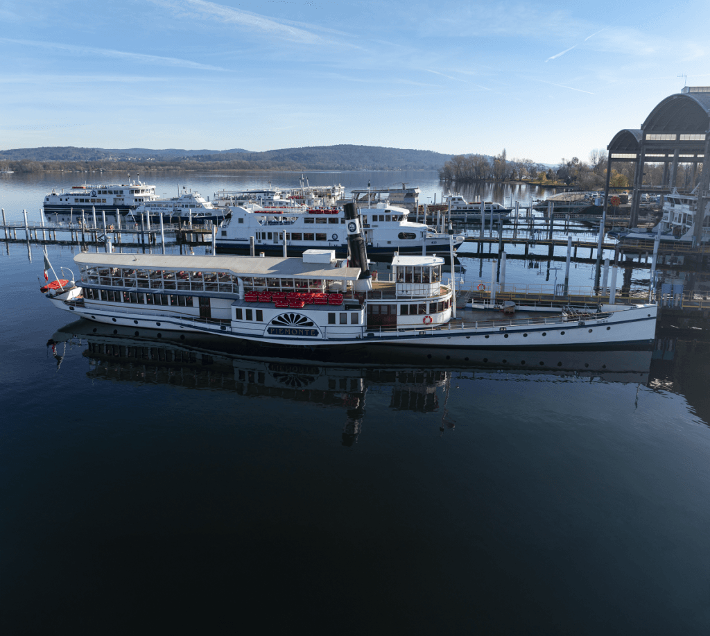 Il Piemonte nasce all’inizio del Novecento, quando l’INLM commissionò alla Escher Wyss & C. di Zurigo due piroscafi “a salone” in ferro a ruote, capaci di trasportare 500 passeggeri. Il Francia entrò in servizio nel 1903, seguito nel 1904 dal Regina Madre, lungo 48,5 metri e dotato di macchina a vapore. Dopo l’armistizio del 1943 fu rinominato Piemonte. Rimase in servizio fino al 1948, subendo poi ammodernamenti, tra cui il passaggio da carbone a nafta. Negli anni ’60 fu restaurato ad Arona. Oggi monta caldaie moderne che riproducono fedelmente quelle originali, mantenendo intatti elementi storici, come le ruote a pale e la macchina a vapore del 1903.