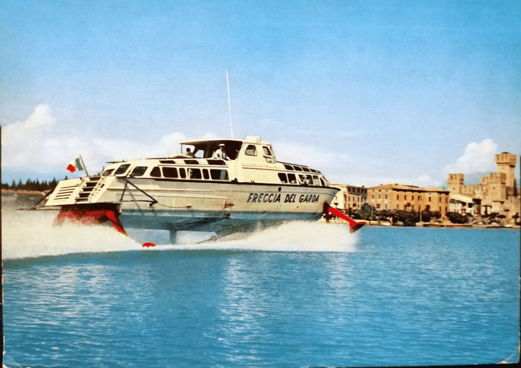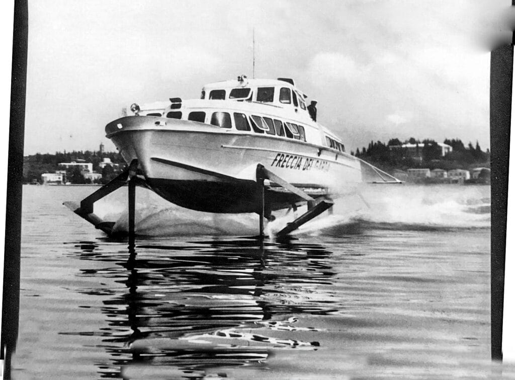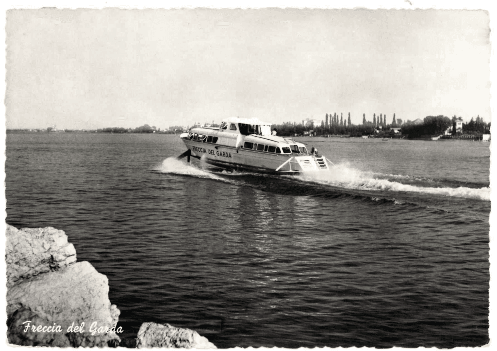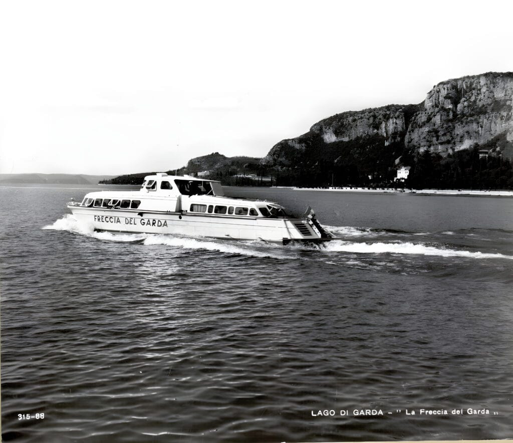 Era il 1958 quando fece il suo debutto sul Garda, rivoluzionando il mondo della navigazione. Parliamo dell’aliscafo Freccia del Garda, costruito dai Cantieri navali Rodriquez, un’innovativa “barca volante”, che divenne subito simbolo di modernità: grazie alle ali portanti, infatti, lo scafo si sollevava completamente dall’acqua, offrendo velocità e spettacolo. In un territorio che negli anni ’50 stava rinascendo come meta turistica, la Comunità del Garda promosse l’introduzione del nuovo mezzo, gestito con Navigarda. L’aliscafo affascinò talmente il pubblico che ne fu prodotto anche un modellino giocattolo.